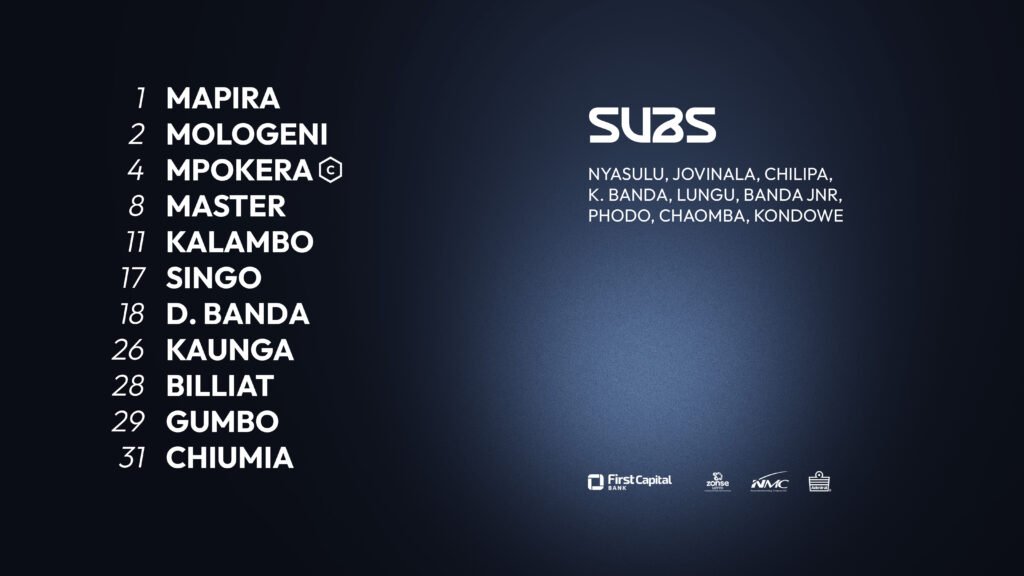 1 Pilirani Mapira; 2 Yamikani Mologeni, 4 Blessings Mpokera (C), 31 Prince Chiumia, 26 Emmanuel Kaunga; 17 Yankho Singo, 8 Paul Master, 29 Chawanangwa Gumbo; 28 Misheck Billiat, 11 Clever Kalambo, 18 Dastan Banda.