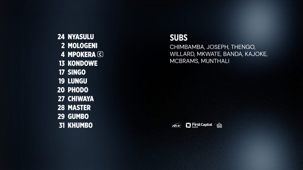The substitutes for today’s fixture include Richard Chimbamba, Blessings Joseph, Edward Thengo, Frank Willard, Mike Mkwate, Peter Banda, Sean Mcbrams, Hassan Kajoke, and Bright Munthali, giving the coach options to inject fresh energy if needed.